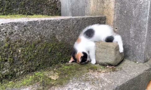 苔の生えた石段の端っこに置かれた大きな石の上に、三毛の子猫が覆い被さるような体勢でいるのを発見した撮影者です。