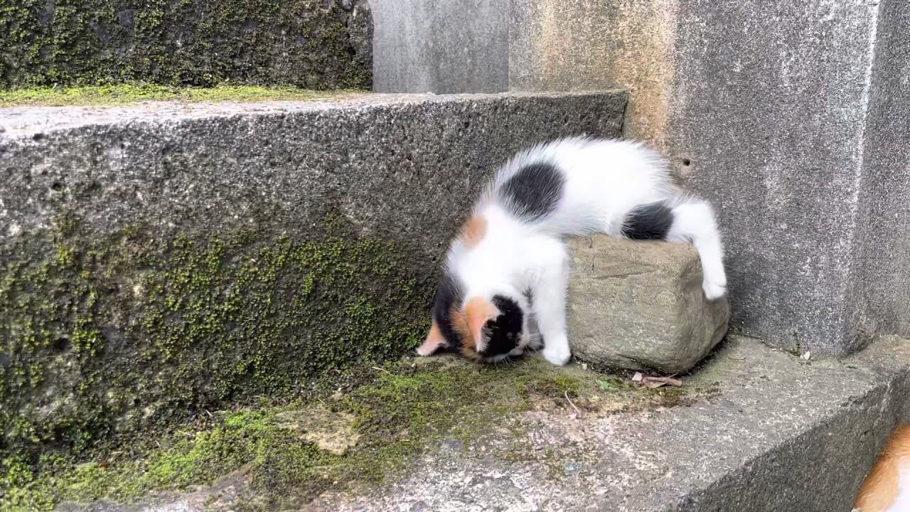 石段でとんでもない寝かたで爆睡する子猫