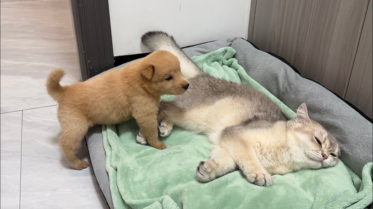 全く空気の読めない子犬は、なおも猫さんの後ろ足をぺろぺろ舐め続けます。すると猫さんが子犬の頭をパシッ!その後は、子犬がベッドに入り込んで猫さんにぴったり寄り添って仲良く昼寝を始めました。