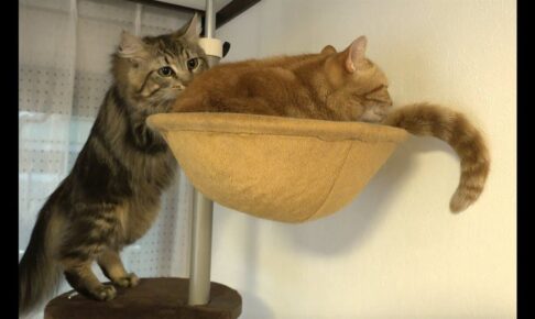 そして勝ち誇ったように奪い取ったハンモックのなかで優雅に毛づくろいを始めるのでした。