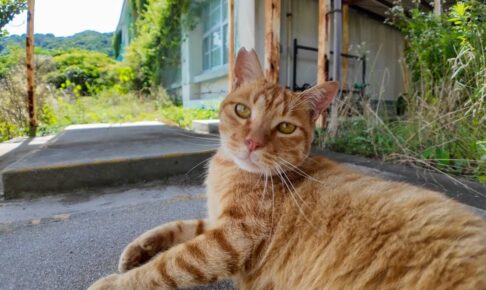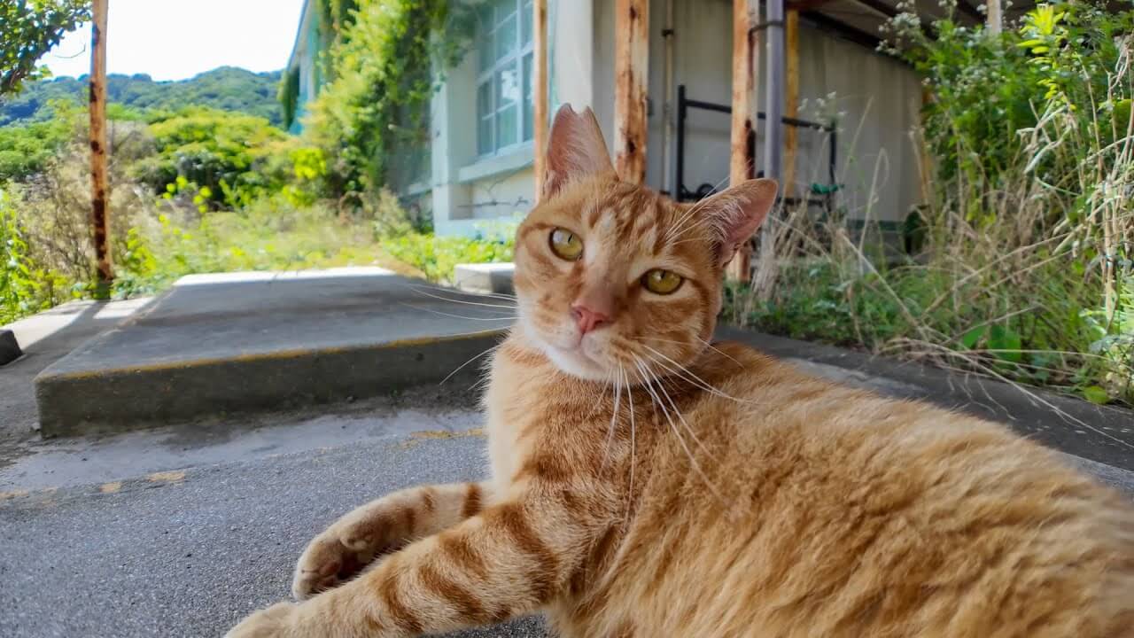 廃校になってしまった学校の敷地内にはたくさんの猫たちが暮らしています。体育館裏に行ってみると、そこには茶トラ猫さんがのんびりと寝そべっていました。