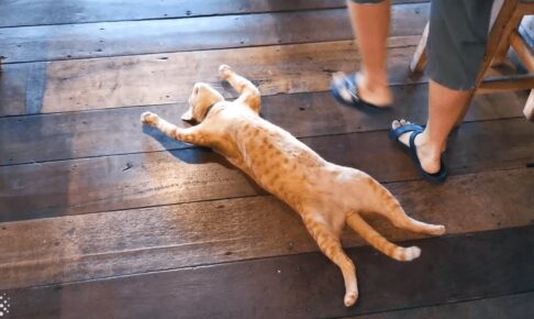 食堂のど真ん中で大の字で爆睡するニャンコ