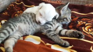 【天使の寝顔!】先住猫の隣で「笑いながら」幸せそうに眠る子猫!究極の癒やし添い寝!
