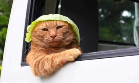 キャベツを頭に乗せ、寛ぐ姿が愛らしい猫ちゃんでした。