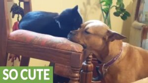 ワンちゃんに毛づくろいする猫