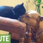 もしかしてウチの子達に何するニャ!と怒るのかと思いきや、なんと母猫までワンちゃんにメロメロの様子。