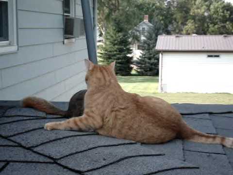 でっぷりと太った茶トラ猫さんが家の屋根の上で野生のリスと一緒にじゃれあいながら遊んでいます。なんと珍しい光景でしょう!