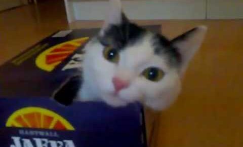 一旦は頭を箱から引っこ抜いて諦めたかのように見えた猫さんでしたが、一旦箱の周りをぐるりと回って、他に入れる隙間がないかどうかを確認したあと、最初に挑戦した穴に再びチャレンジすることにしたようです。