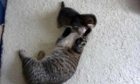 こら!やめろにゃ!お父さんは子猫のことを叱りますが何せイタズラ盛りな子猫ですからすんなりと言うことを聞くわけもありません。