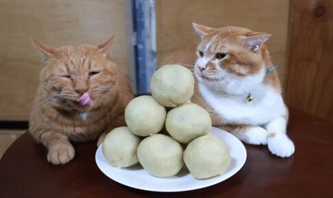 かご猫家のおばあちゃんが秋彼岸のためのまんじゅうづくりをしています。小豆を枡で計量しているのを興味津々で食い入るように見つめるお手伝い係のにゃんこたちです。 ザラザラ〜という音に反応して、手を出したくてウズウズしています…