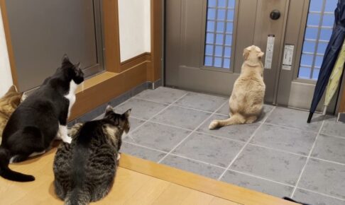 ベッドの上でキジトラの猫さんがぐっすりと昼寝しています。するとそこへゴールデンレトリバーがやってきて、寝ている猫さんを見て残念そうな表情をします。 どうやらゴールデンは猫と一緒に遊びたかったようです。ワンちゃんはベッドの…