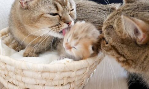 カゴのベッドの中にいる赤ちゃん猫を優しく見守るママ猫さん。愛おしい我が子をじっと見つめるその瞳からは母猫としての深い愛情が感じられます。 ベッドの中にいる赤ちゃん猫の毛づくろいをしてあげようとママ猫さんは狭いベッドの上に…