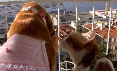 ここはトルコのイスタンブールのボスポラス海峡です。仲良しなワンコとにゃんこが一緒に肩を並べて家のベランダの特等席から美しい景色を眺めています。 目の前にはクルーズ船が停泊しており、さらに海原が広がりまさに絶景です。2匹は…