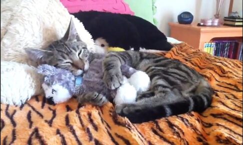 子猫がぬいぐるみを枕にして気持ちよさそうに寝ています。 今ではこんなに幸せそうに寝ている子猫ですが、保護された当時は全身がノミだらけで悲惨な状態だったのが想像できません。 横になってぽんぽこりんに膨らんでいるお腹は、たっ…