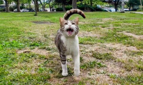 公園の遊歩道の端のアスファルトの上でまったりしている三毛猫さんを発見したので近づいてみます。ふと三毛猫さんのしっぽのほうをみると、そこには、なんと可愛い子猫が1匹立っていました。 子猫は人が急に近づいてきたので恐怖心から…
