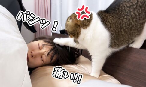 茶トラ猫の小次郎がヘソ天になってこれから寝ようとしている時に、その顔を撫でるようにパタパタと動くしっぽが邪魔をしてきます。 顔の上を何度も往復して叩かれてしまうので、さすがに小次郎もイラっとしてしまってしっぽを前足で持ち…