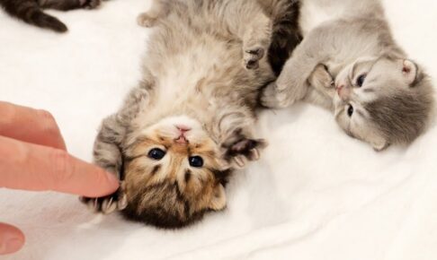 まだキトゥンブルーの瞳の色が残る可愛い子猫が飼い主さんに甘えています。お腹いっぱいになった後にこのように甘えているようです。 ミルクで膨らんだお腹を出して四本の手足を上に突き出し肉球を惜しげもなく見せてくれています。 お…