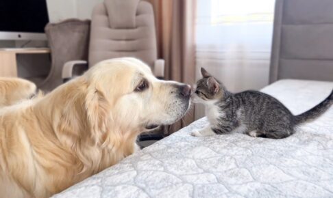 白いボックスのなかには生まれたばかりの赤ちゃん猫たちが入っています。ゴールデンレトリバーのワンコが、興味津々で赤ちゃん猫たちの匂いをクンクン嗅ぎまくります。 ふんわりとしたミルクの香りや赤ちゃん猫独特の優しい香りがとても…