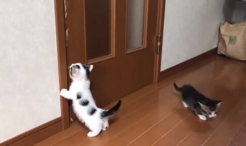 子猫部屋の片付けをしている飼い主さんのことをじっと見つめる視線が感じられたと思ったら襖が少し開けられていてその隙間から可愛い二匹の猫たちの顔がのぞいています。顔が上下に重なっていてとてもかわいいです。 我慢できずに先頭の…