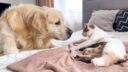 最初はベッドで気持ちよさそうに寝ていた猫ですが、布団から出てリボンを付けてパパに懐いている姿がかわいいです。猫は好奇心が強くて近くにいる人について行く姿が愛らしく、まさに家族の一員という感じがします。パパは布団から出て来…