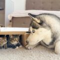 【子猫を奪え!】巨大なハスキー犬が「子猫入りダンボール」を強奪!? その優しい行動に感動!