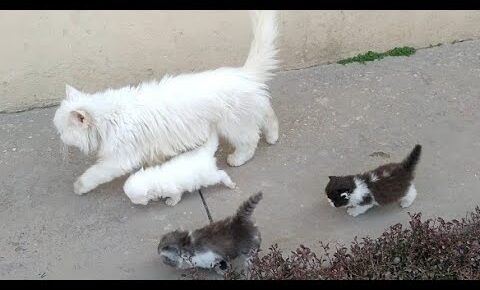 ふわふわな白猫さんが可愛い子猫たちを連れて歩いています。毛玉みたいな子猫たちは転がるように外を歩き、とても楽しそうにしています。 3匹の子猫たちはお母さん猫のあとをちゃんとくっついて歩いています。 それでも時々道草をくっ…