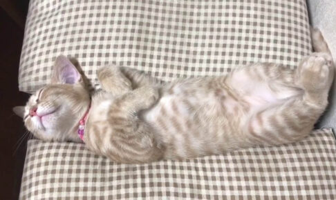 子猫のひのきがソファの上で気持ちよさそうにお昼寝中です。そこへ爪切りを持ったお母さんがそーっと近づいてきました。 子猫の爪はとても鋭くこまめに爪切りをしないと大変なことになります。 でも目が覚めている時は絶対にじっとして…