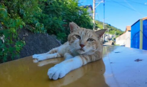 真夏の昼下がりに茶トラの猫さんが地域猫用に設置されていたハウスの上で伸びて昼寝していました。前足を伸ばしてその上に頭を乗せてとてもリラックスした様子です。 そーっと近づいてみますが、ぐっすり眠ったままです。背中を優しく撫…