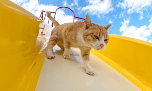 猫島にある滑り台のある公園を訪れたボランティアさんを茶トラ猫さんが元気よく出迎えてくれました。力強い声で鳴き続けながら全身で喜びを表しています。 背中を撫でてもらうと背中を丸めるようにして尻尾もまっすぐに伸ばし、相当ごき…