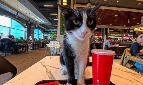 今回ご紹介するのは、「感動猫動画」チャンネルから、なんとショッピングモールのフードコートに猫がやってくるという、驚きの日常動画です!食事中の撮影者さんの元へ、一匹の猫がためらうことなく接近。まるで「ねぇ、美味しいニオイが…