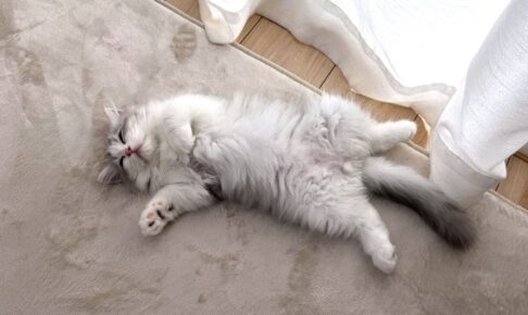ソファでゆったりくつろぎ中の男性のひざのうえにべったりお腹をくっつけて寝そべっている猫の姿があります。まるで猫の敷物みたいに4本の手足を広げて最高にリラックスした格好になっています。 この猫さんはもともとかなり大柄な猫さ…