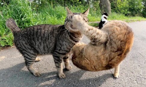 路地裏を歩いているとキジトラのハンサムボーイがアスファルトの道路の上に寝転がっていました。撫でてあげると目を細めながら気持ちよさそうにしてくれました。 背中もたくさん撫でてあげると、それも大歓迎のようでウットリとした表情…